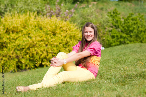 Pretty smiling girl relaxing on green meadow. Soft focus. Focus