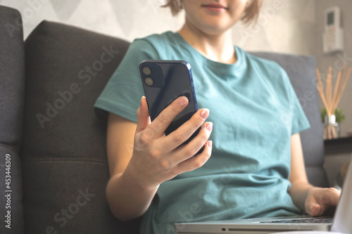Pretty smiling girl using smartphone indoor in autumn weekend days, hand with modern mobile phone in october