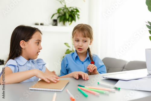 Pretty stylish schoolgirls studying during her online lesson at home, social distance during quarantine, self-isolation, online education concept