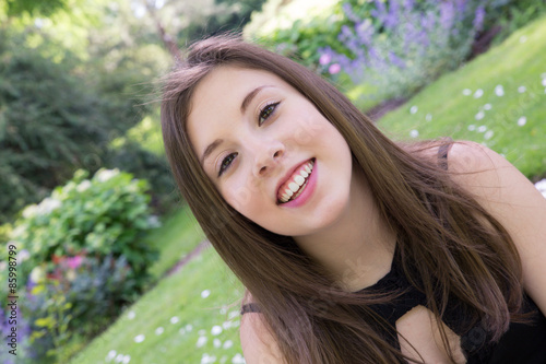 Pretty teenage girl sitting on ground in garden with soft filter effect