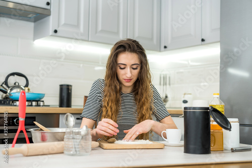 Pretty woman kneading dough at home, cooking food for healthy lifestyle