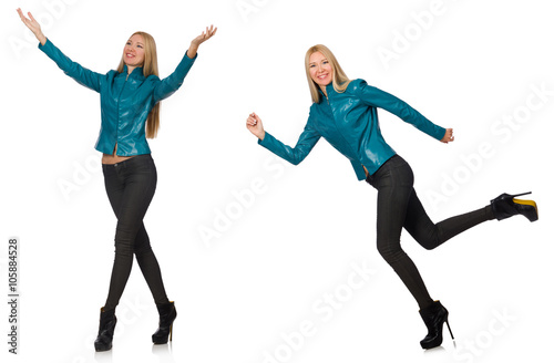 Pretty woman in blue leather jacket isolated on white