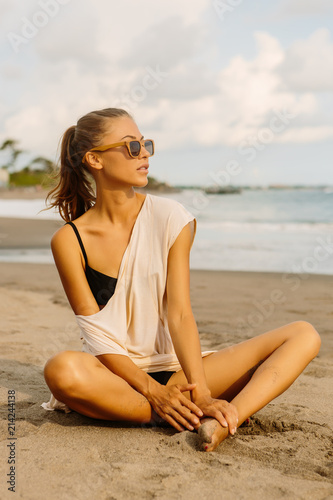 Pretty woman in casual clothes sit on the sand with crossed legs. Sexy lady on tropical exotic sea beach sunset or ocean sunrise. Travel, explore, active yoga and meditation lifestyle concept.