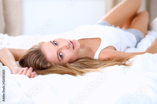 Pretty woman lying down on her bed at home
