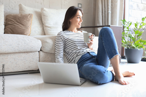 Pretty woman working with laptop while sitting on floor at home and drinking coffee.
