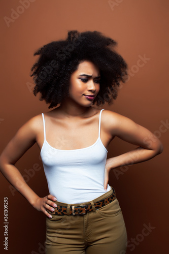 pretty young african american woman with curly hair posing cheerful gesturing on brown background, lifestyle people concept