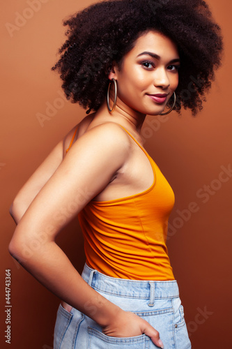 pretty young african american woman with curly hair posing cheerful gesturing on brown background, lifestyle people concept
