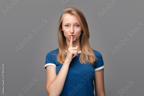 Pretty young blonde woman keeps finger on lips, making hush gesture. Shh, silence concept. Studio shot, gray background