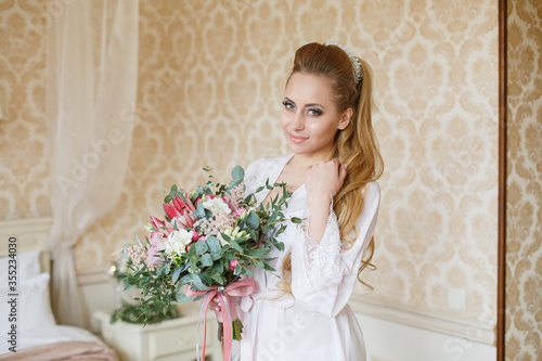 Pretty young Bride. Blonde-haired woman with wedding hair-style with a long tail. Boudoir morning of the bride. Looking on her bouquet