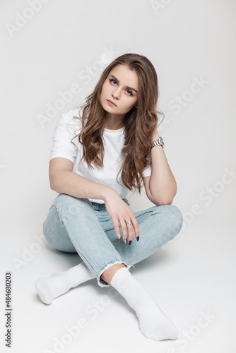 Pretty young girl with a hairstyle in a white T-shirt with blue vintage jeans and white socks sits in the studio