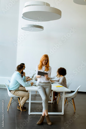 Pretty young red hair woman using digital tablet