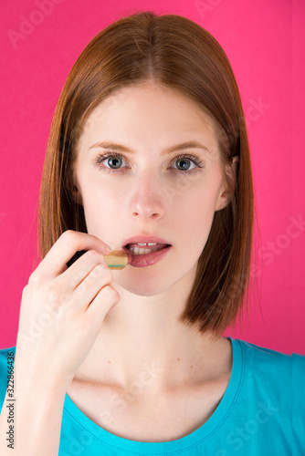 Pretty young woman applying nude color lipstick. Model with blue eyes and natural red hair and light skin with freckles