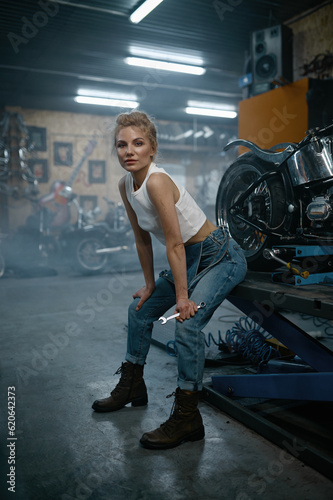 Pretty young woman mechanic sitting at motorcycle