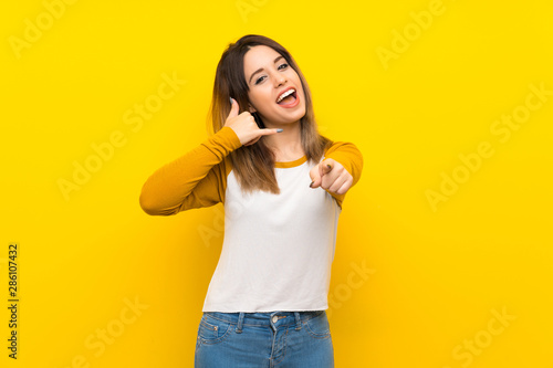 Pretty young woman over isolated yellow wall making phone gesture and pointing front