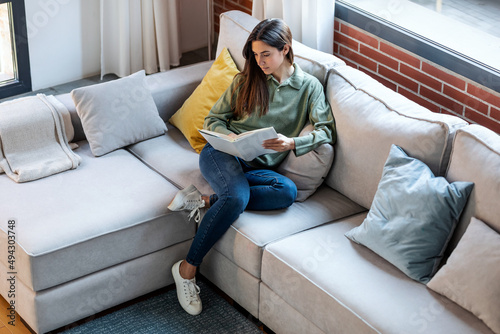 Pretty young woman reading a book while sitting on sofa at home.
