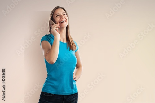 Pretty young woman using smartphone standing on background