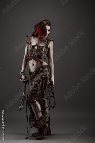 Pretty young woman with red eyes wearing post apocalyptic clothing