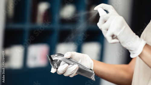Preventive measures of beauty industry. Close up of hairdresser disinfecting electric trimmer after work