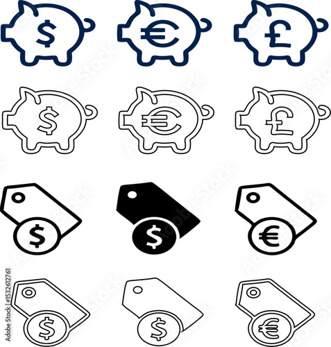 price label and piggy bank icon vector set