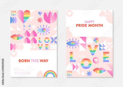 Pride month poster templates.LGBTQ+ community vector illustrations in bauhaus style with geometric elements and rainbow lgbt symbols.Human rights movement concept.Gay parade.Colorful cover designs.