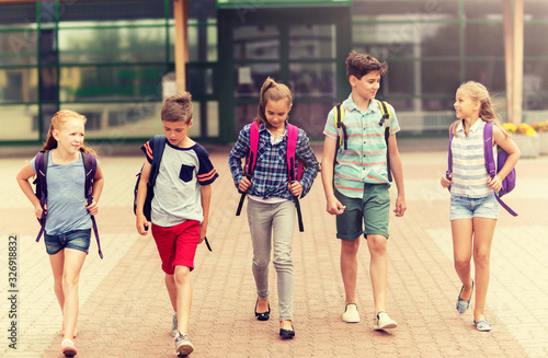 primary education, friendship, childhood, communication and people concept - group of happy elementary school students with backpacks walking and talking outdoors