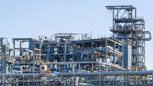 Primary processing of crude oil entering the refinery. Equipment for the production of fuel components. The plexus of pipelines at a chemical plant. The pipeline at the gasoline production plant.