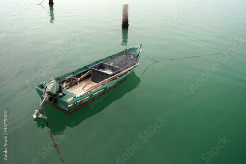 Primo piano di barca su mare calmo e limpido colore verde acqua