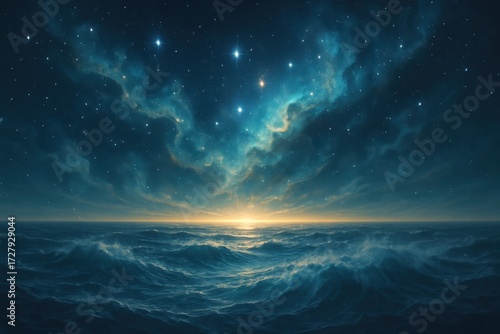Primordial cosmos forming swirling seas and newborn stars in a luminous celestial expanse