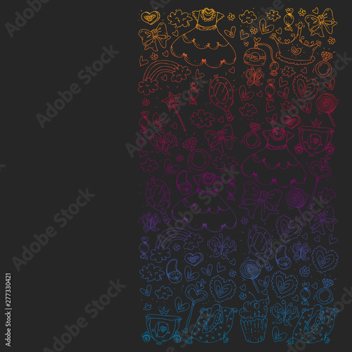 Princess birthday party for little girls. Kindergarten, school children picture. Illustration for children with castle, fairy, dress, crown.