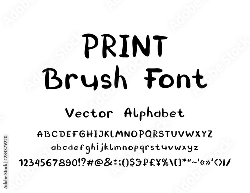 Print brush vector font. English uppercase and lowercase alphabet letters, numbers, punctuation marks, currency symbols. Typeface hand drawn with a brush and black ink