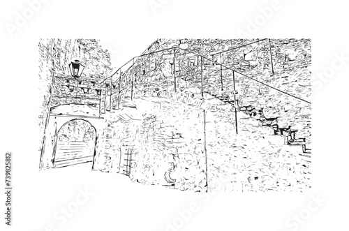 Print Building view with landmark of Kotor city. Hand drawn sketch illustration in vector.