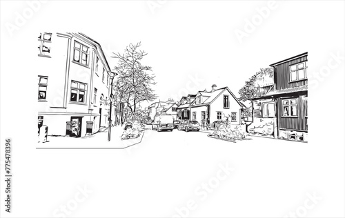 Print Building view with landmark of Reykjavík is the capital in Iceland. Hand drawn sketch illustration in vector.