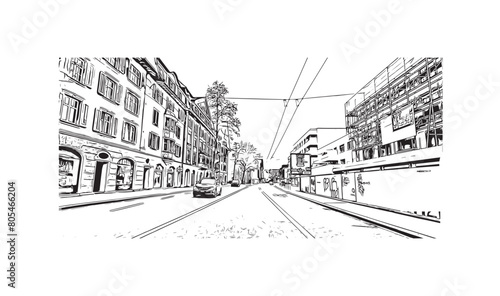 Print Building view with landmark of St. Gallen is the city in Switzerland. Hand drawn sketch illustration in vector.