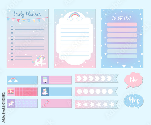 Printable and sticker with unicorn,cake,donut,crown,rainbow,glasses and ribbon in fairytale style