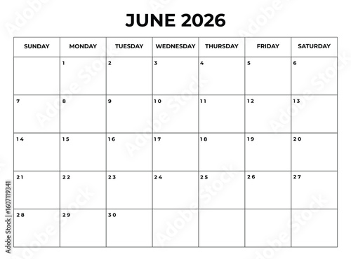 Printable June 2026 Calendar with Daily Boxes Week Starts from Sunday
