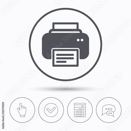 Printer icon. Print documents technology symbol. Chat speech bubbles. Check tick, report chart and hand click. Linear icons. Vector