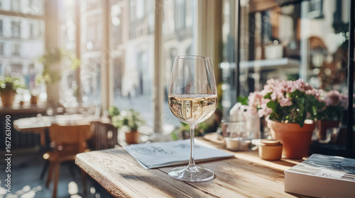 Pristine glass of chilled white wine sits on sun-drenched rustic wooden table in cozy urban cafe, with vibrant city street scene softly blurred in background.