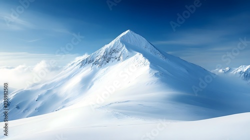 Pristine snowy mountain peak under a clear blue sky, untouched white slopes, crisp and cold winter air, dramatic lighting, high contrast, panoramic view.