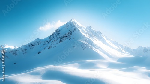 Pristine snowy mountain peak under a clear blue sky, untouched white slopes, crisp and cold winter air, dramatic lighting, high contrast, panoramic view.