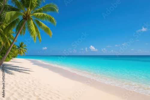 Pristine white sand beach with crystal-clear turquoise water creating perfect tropical paradise backdrop for luxury resort marketing