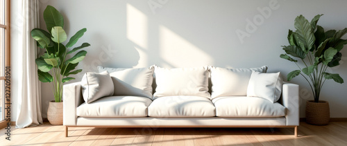 pristine white sofa with plush cushions sits in a sunlit minimalist living room flanked by potted plants