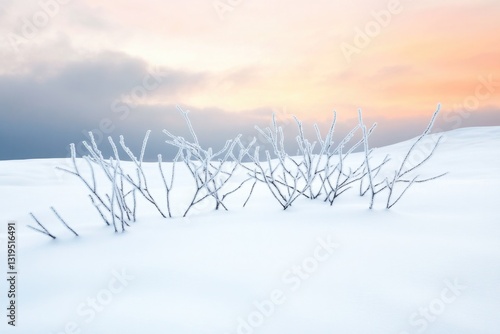 pristine winter garden blanketed in snow with delicate frost-covered branches against cloudy sky backdrop