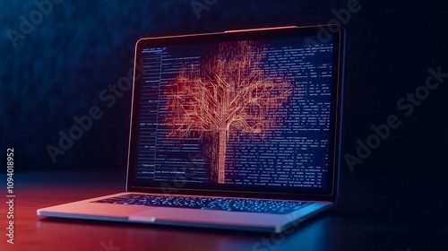 privacy data protection sensitive concept. Laptop displaying a digital tree image with coding backdrop, dark ambient lighting.