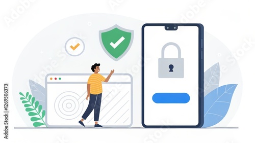 Privacy first financial solution. Digital security concept featuring a person with a locked smartphone and shield icons.