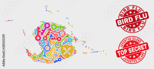 Privacy Juventud Island map and watermarks. Red rounded Top Secret and Bird Flu distress watermarks. Colorful Juventud Island map mosaic of different access icons. Vector collage for guard purposes.