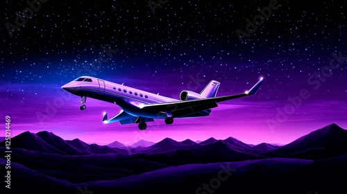 Private Jet Night Flight - Luxurious private jet ascends into a vibrant purple and dark night sky, symbolizing freedom, travel, luxury, success, and adventure.