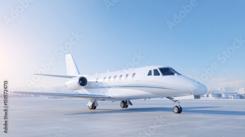 private jet parked on deserted tarmac under clear blue sky