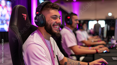 pro gamer man in headphones live streaming while playing online computer game, neon lights, esports, gaming, monitor, play, young, player, internet, enjoyment, cyber, e sport.