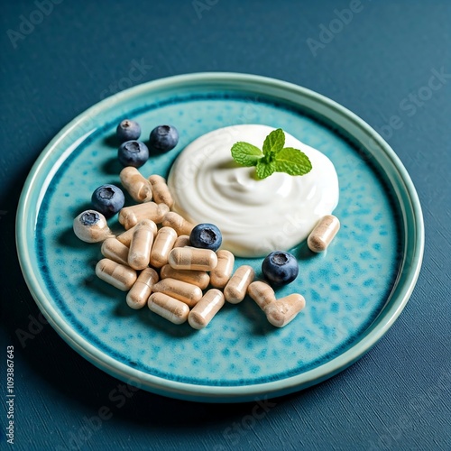probiotics, frosted capsules, yogurt culture, gut health, blueberries, mint garnish, wellness concept , medications, supplements ,medicine, capsules, pills, supplements, medicine, healthcare