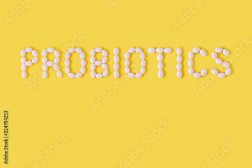 Probiotics word made of pills on yellow background. Flat lay, top view, free copy space.